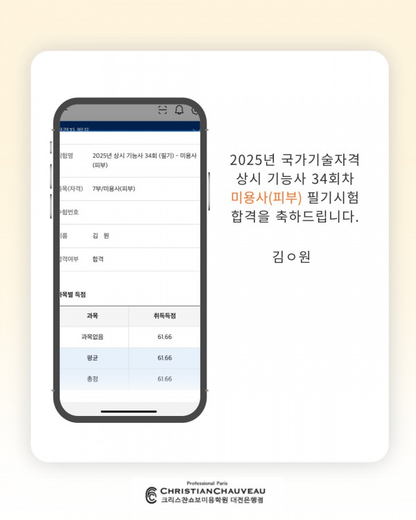 미용사(피부) 필기시험 합격을 축하드립니다.
