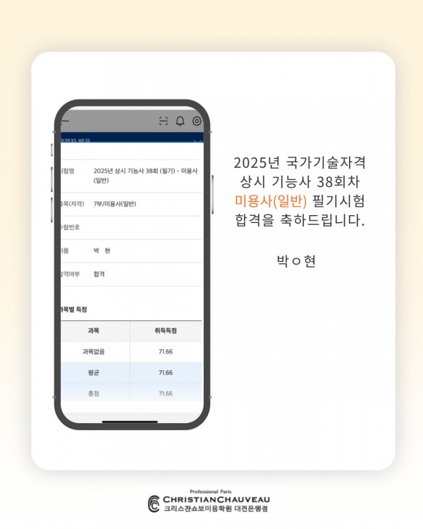 미용사(일반) 필기시험 합격을 축하드립니다.