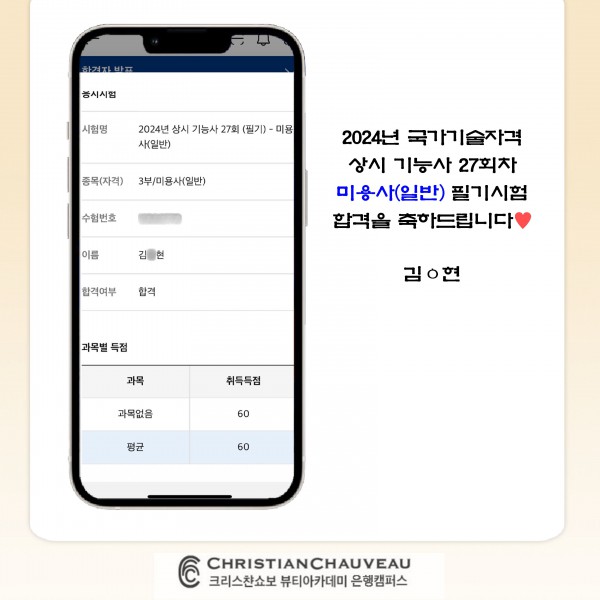 미용사(일반) 필기시험 합격을 축하드립니다.