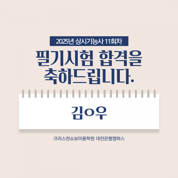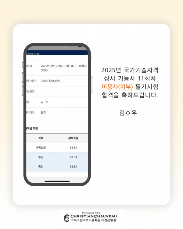 미용사(피부) 필기시험 합격을 축하드립니다.
