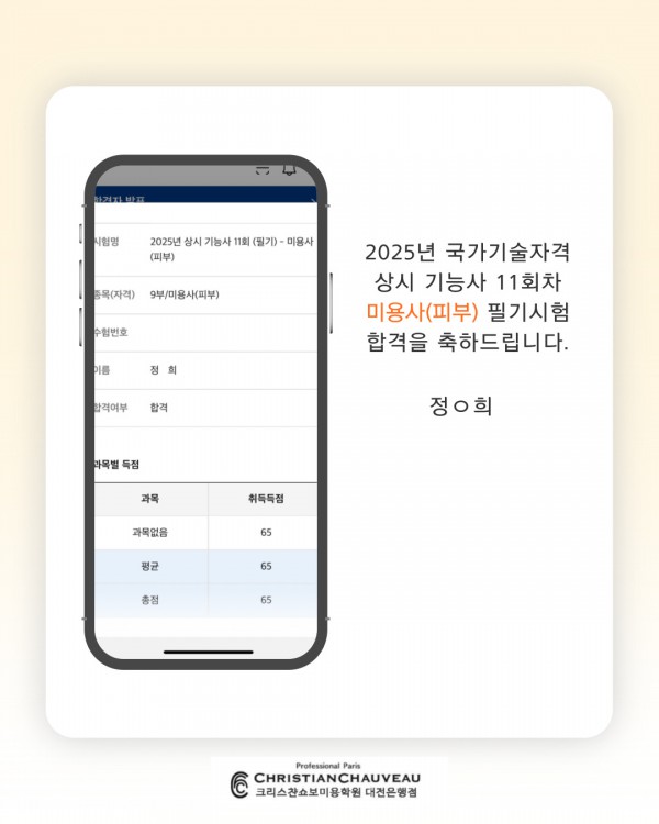 미용사(피부) 필기시험 합격을 축하드립니다.