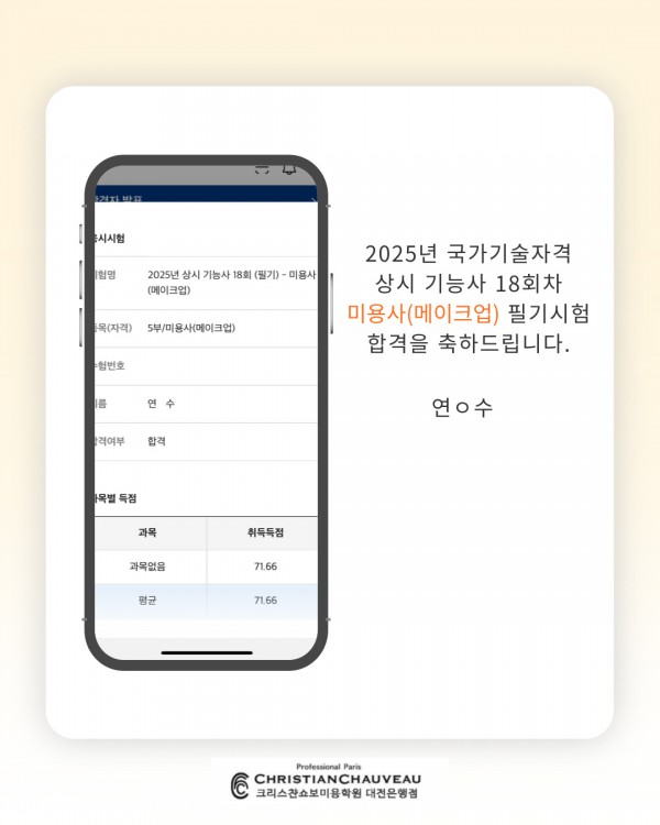미용사(메이크업) 필기시험 합격을 축하드립니다.