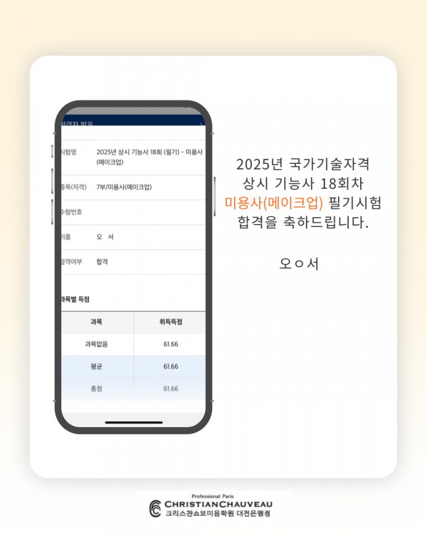 미용사(메이크업) 필기시험 합격을 축하드립니다.
