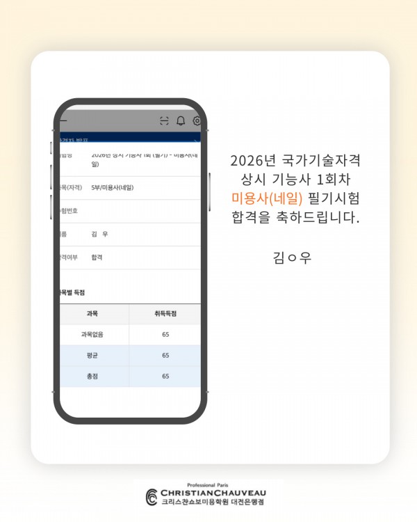 미용사(네일) 필기시험 합격을 축하드립니다.