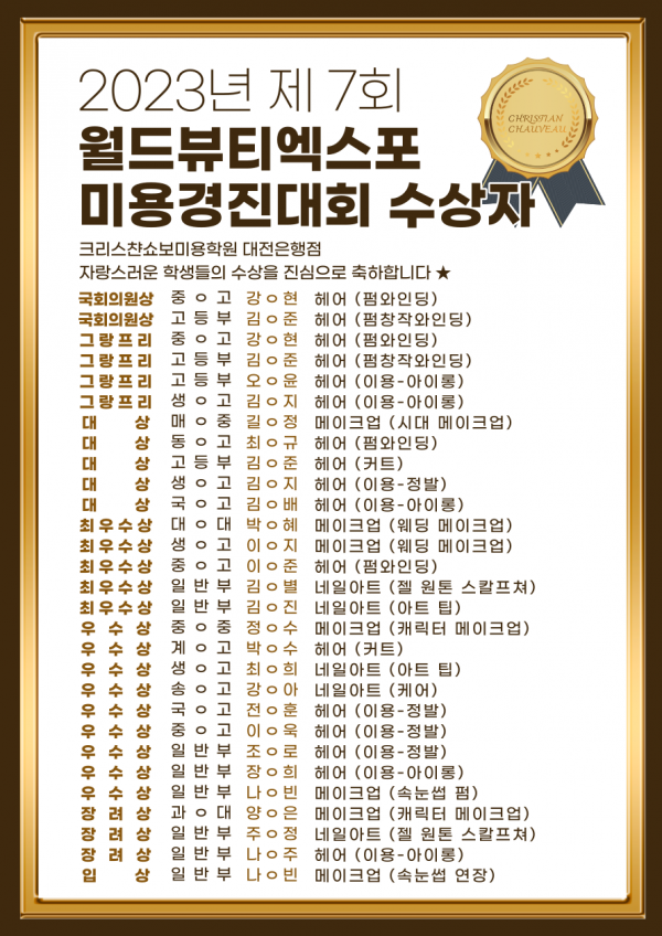 2023년 제7회 월드뷰티엑스포&뷰티페스티벌 대회 수상을 축하드립니다.