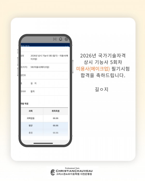 미용사(메이크업) 필기시험 합격을 축하드립니다.