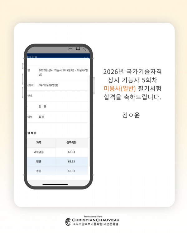 미용사(일반) 필기시험 합격을 축하드립니다.