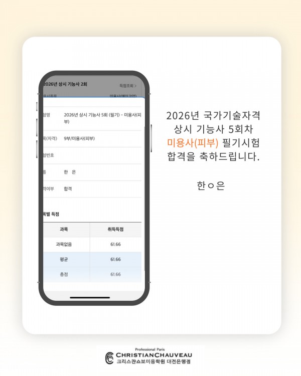미용사(피부) 필기시험 합격을 축하드립니다.
