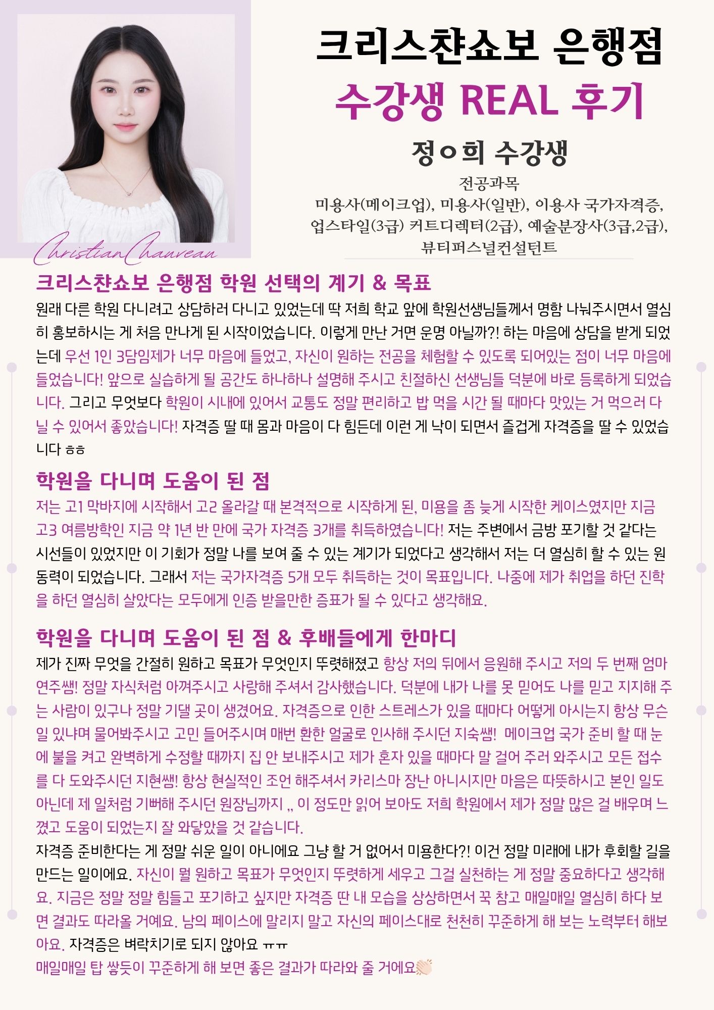 - 제가 진짜 무엇을 간절히 원하고 목표가 무엇인지 뚜렷해졌고 항상 저의 뒤에서 응원해 주시고 저의 두 번째 엄마 연주쌤! 정말 자식처럼 아껴주시고 사랑해 주셔서 감사했습니다. 덕분에 내가 나를 못 믿어도 나를 믿고 지지해 주는 사람이 있구나 정말 기댈 곳이 생겼어요. 자격증으로 인한 스트레스가 있을 때마다 어떻게 아시는지 항상 무슨 일 있냐며 물어봐주시고 고민 들어주시며 매번 환한 얼굴로 인사해 주시던 지숙쌤! 메이크업 국가 준비 할 때 눈에 불을 켜고 완벽하게 수정할 때까지 집 안 보내주시고 제가 혼자 있을 때마다 말 걸어 주러 와주시고 모든 접수를 다 도와주시던 지현쌤! 항상 현실적인 조언 해주셔서 카리스마 장난 아니시지만 마음은 따뜻하시고 본인 일도 아닌데 제 일처럼 기뻐해 주시던 원장님까지 ,, 이 정도만 읽어 보아도 저희 학원에서 제가 정말 많은걸 배우며 느꼈고 도움이 되었는지 잘 와닿았을 것 같습니다.